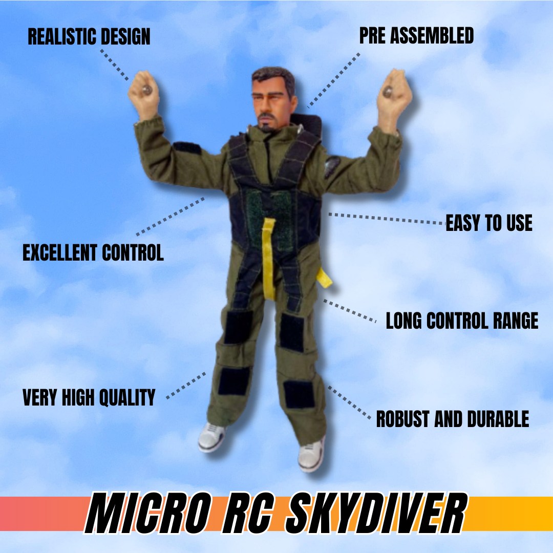 🪂😃Discover our Micro Size RC Skydiver, an exciting product that allows you to open and steer a miniature-scale parachute with remarkable precision. Perfect for thrill-seekers and modeling enthusiasts, this revolutionary miniature parachute combines fun and technology for an exhilarating flight experience.